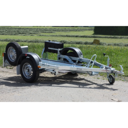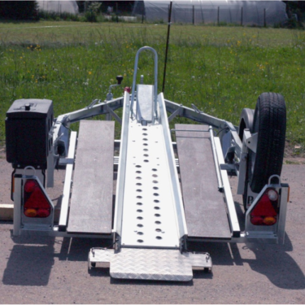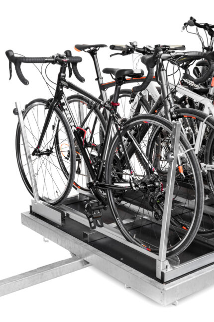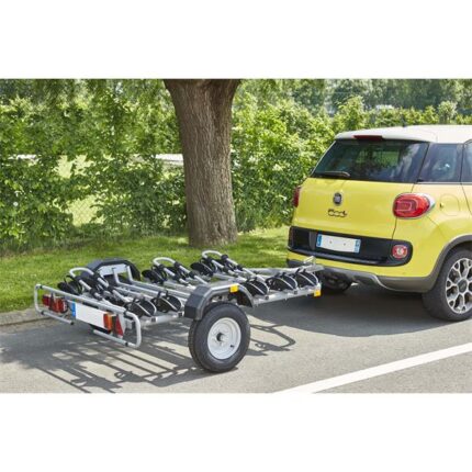Ideal para transportar até 5 bicicletas com carga máxima de 115 kg. As bicicletas são colocadas nos trilhos e apoiadas nos braços rebatíveis do trailer. O reboque está equipado com duas rodas pequenas para facilitar o manuseamento durante o armazenamento, por exemplo quando se pretende guardá-lo verticalmente na garagem. O plugue da placa de identificação tem 7 pinos.
