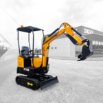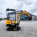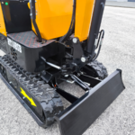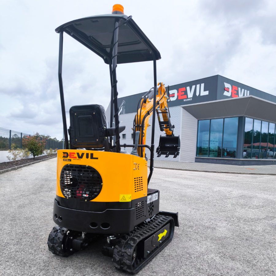 A mini-escavadeira compacta DELEKS® M100 (1 tonelada) está equipada com um motor diesel Kubota D722 de três cilindros, chassi extensível e braço orientável.