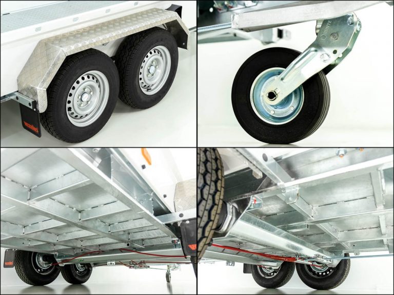 Reboque porta-troncos Vezeko de capacidade muito elevada, equipado com um chassi tubular soldado extremamente estável e totalmente galvanizado a quente